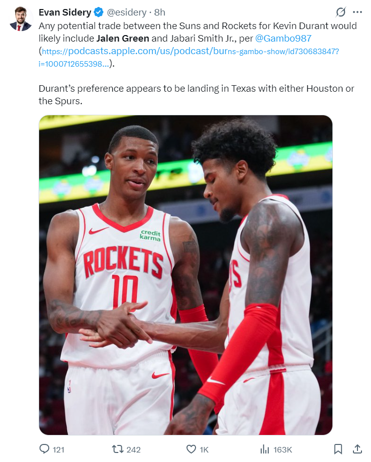 随后太阳队记Gambo跟踪报道,涉及杰伦-格林打包换杜兰特的交易方案中还包含了火箭前锋小贾巴里-史密斯。