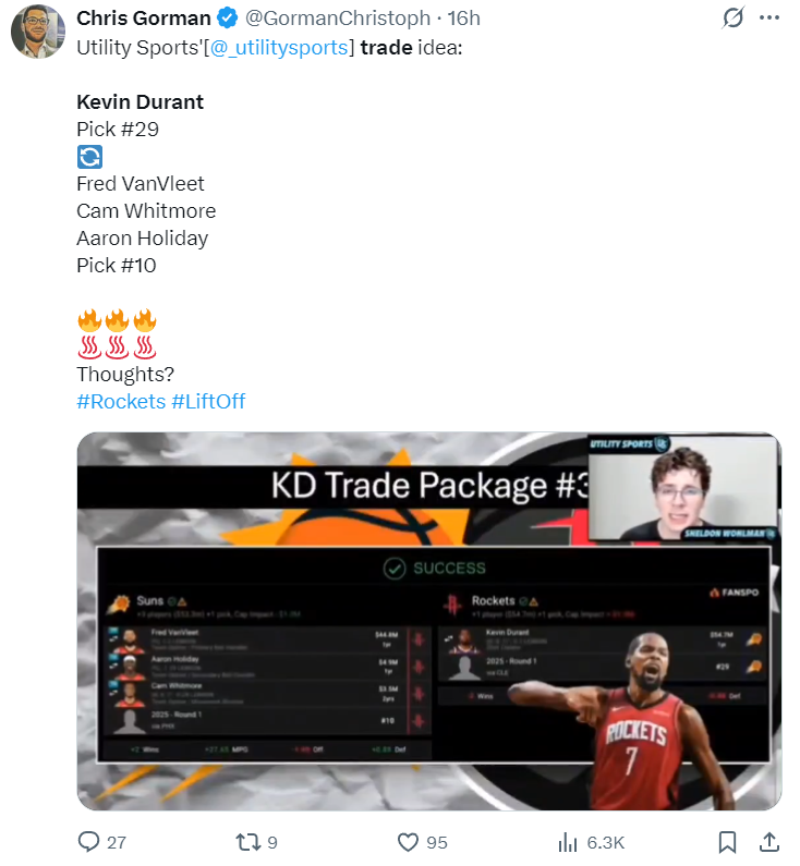 他们表示最好的换杜兰特的方案是用范弗利特、惠特莫尔、霍勒迪、2025年10号签,从太阳换回杜兰特、2025年29号签。火箭队只愿意牺牲7个自主选择的年轻核心中的惠特莫尔,因为惠特莫尔是唯一未能赢得乌度卡信任的那个。