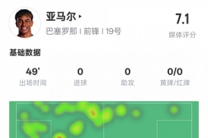 体育资讯5月7日讯 欧冠半决赛次回合,巴萨客战国米。亚马尔首发出战,半场战罢,有3次过人成功,送出1次关键传球,评分7.1。