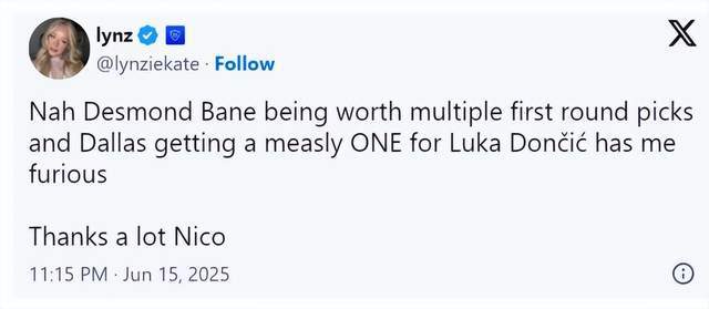而回到灰熊和魔术的交易上,他们送出的是贝恩并非超级巨星,但却换来了五个首轮资产,很难不让人重新想起东契奇的交易。不少独行侠球迷在网上开喷: